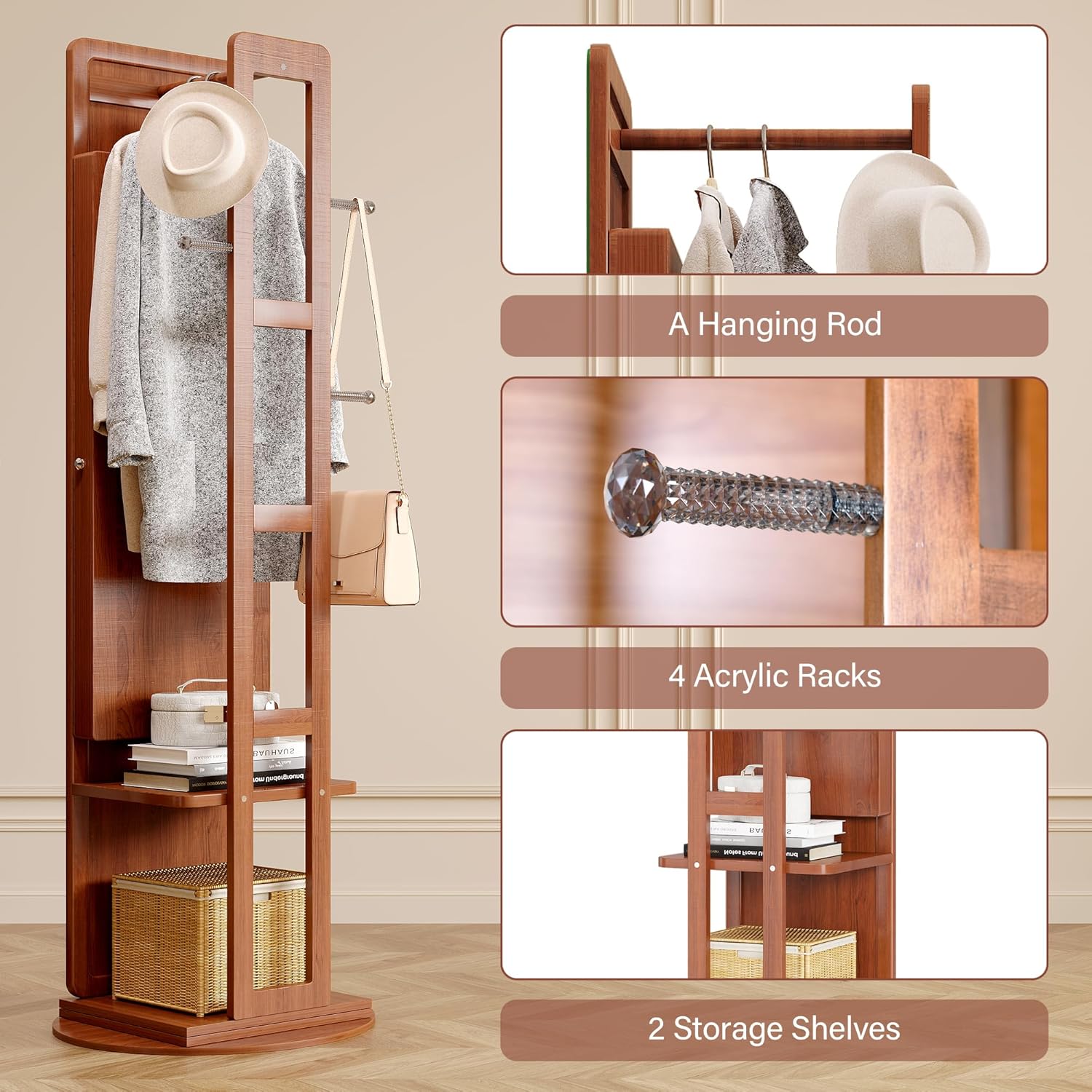 8 reviews for LVSOMT 360° Swivel Jewellery Armoire, Rotatable Full Size Mirror with Jewellery Storage, Standing Jewellery Cupboard with Coat Rack, Walnut, Soild Wooden